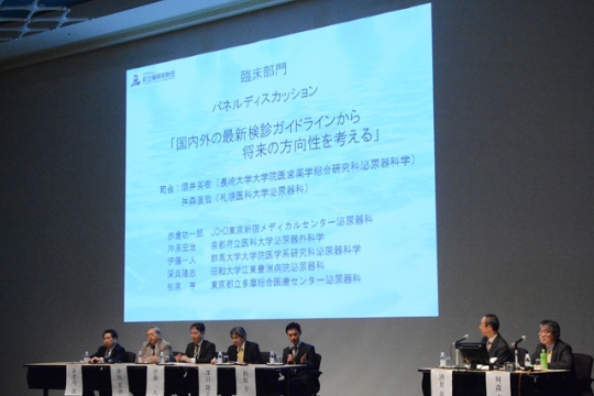 第2日目の「臨床部門」では、教育セミナー2において、Department of Urology, Feinberg School of Medicine Northwestern University, Chicago, Illinois, USAのWilliam J. Catalona先生から「PSA Screening Has Changed the Natural History of Prostate Cancer」というタイトルでご講演いただきました。前立腺がんスクリーニングの米国における混乱の元凶とその影響について、検診中止による転移がんの増加などの疫学データをお示しいただき、最新の重要な研究成果、米国予防医療専門委員会の問題点など、前立腺がんスクリーニングの真実について教えていただき、実社会に極めて大きな影響を与える、素晴らしい講演をしていただきました。また、今回の臨床部門のテーマは「前立腺がんスクリーニング」でした。PSAスクリーニングの前立腺がん死低下効果が確定しましたが、今後は利益/不利益バランスと費用対効果比に優れ、QOL損失を低減させるスクリーニングシステムの構築を目指す必要があります。そのためには、わが国の前立腺がん検診の現状を評価し、研究成果を共有することで、将来の方向性について討議することは重要です。パネルディスカッションでは「国内外の最新検診ガイドラインから将来の方向性を考える」と題し、前立腺がんスクリーニングをリードしている5人の指名パネリストより講演が行われ、国内外の前立腺がん検診ガイドラインの重要な点、問題点について講演があり、わが国において、適切な前立腺がん検診システムを構築するための方向性について討論が行われました。また、公募による発表では、 検診の現状、最適な検診システム、質の高い前立腺がん確定診断のための生検方法など、37演題の研究発表がありました。